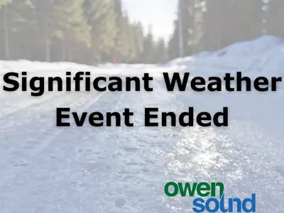 In accordance with the Provincial Minimum Maintenance Standards, the City of Owen Sound is declaring an end to the Significant Weather Event that was issued on December 31, 2025 and extended on January 5th, 2026.